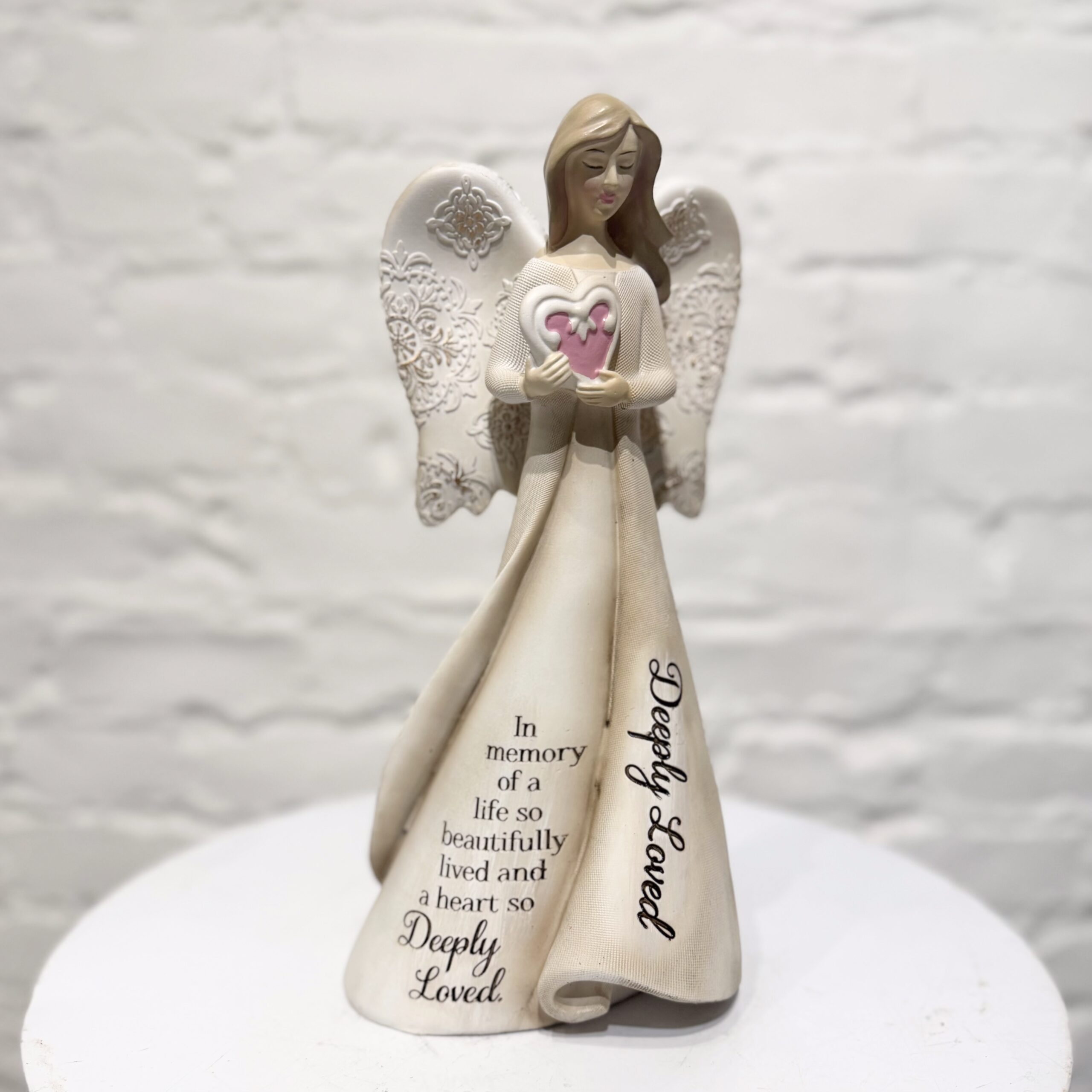 This elegant sympathy angel is a touching tribute to a life beautifully lived and deeply loved. Crafted in soft, neutral tones with delicate detailing, she gently holds a pink heart while her flowing gown bears the words, “In memory of a life so beautifully lived and a heart so deeply loved.” With graceful wings and a serene expression, this keepsake offers comfort, remembrance, and a lasting symbol of love.