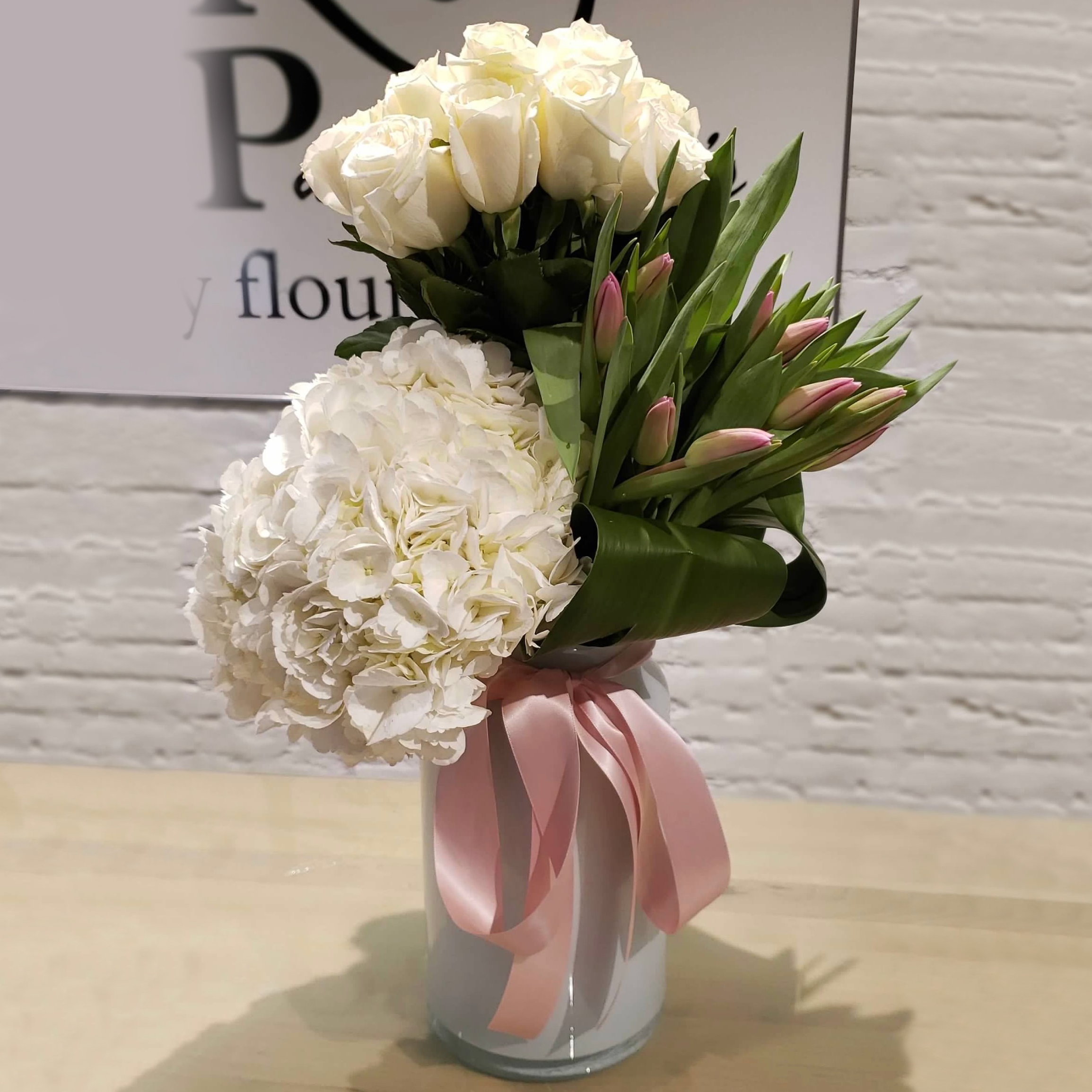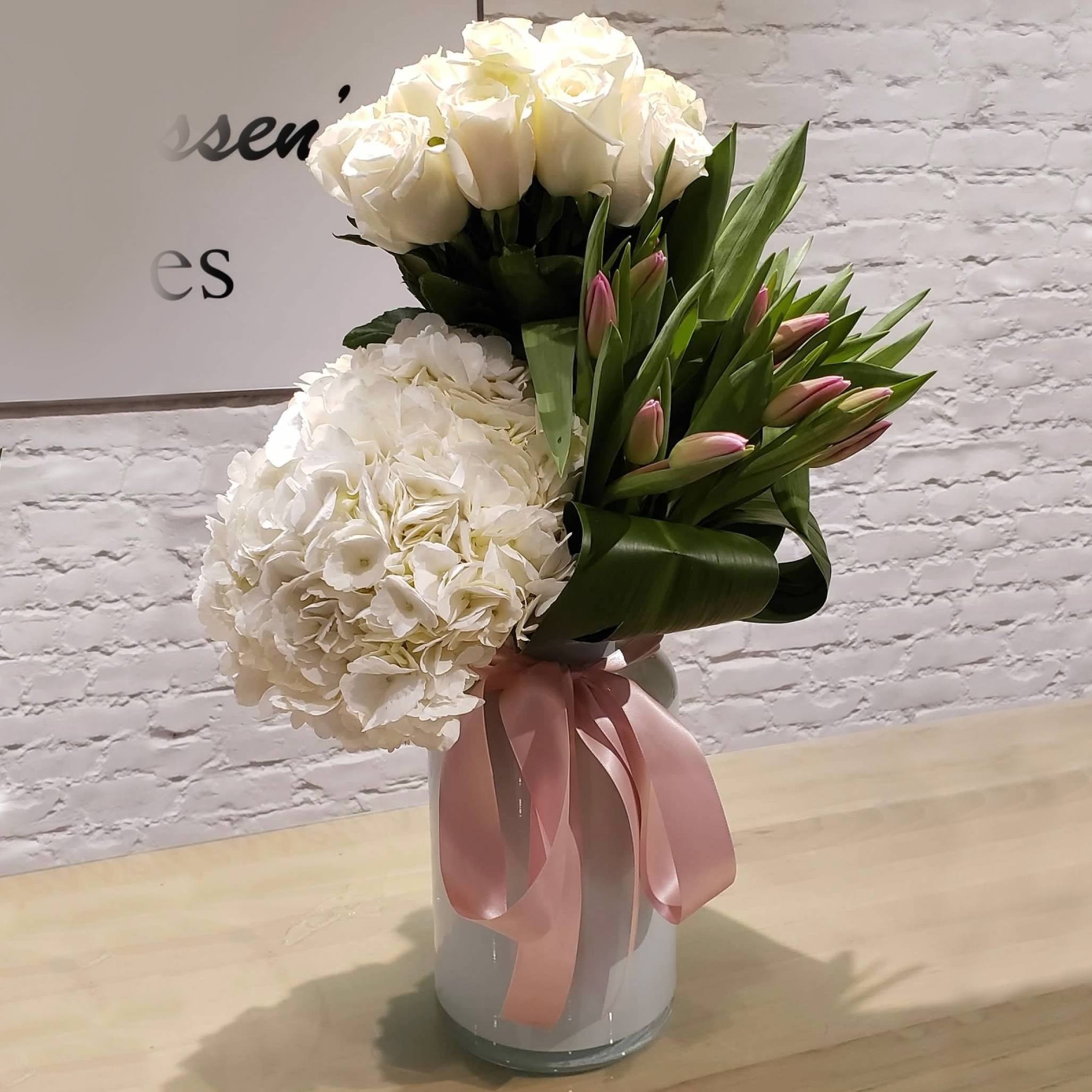 This modern sympathy design is made up of clustered white roses, fluffy hydrangeas and beautiful tulips, elegantly displayed in a tall glass vase with a matching satin ribbon.