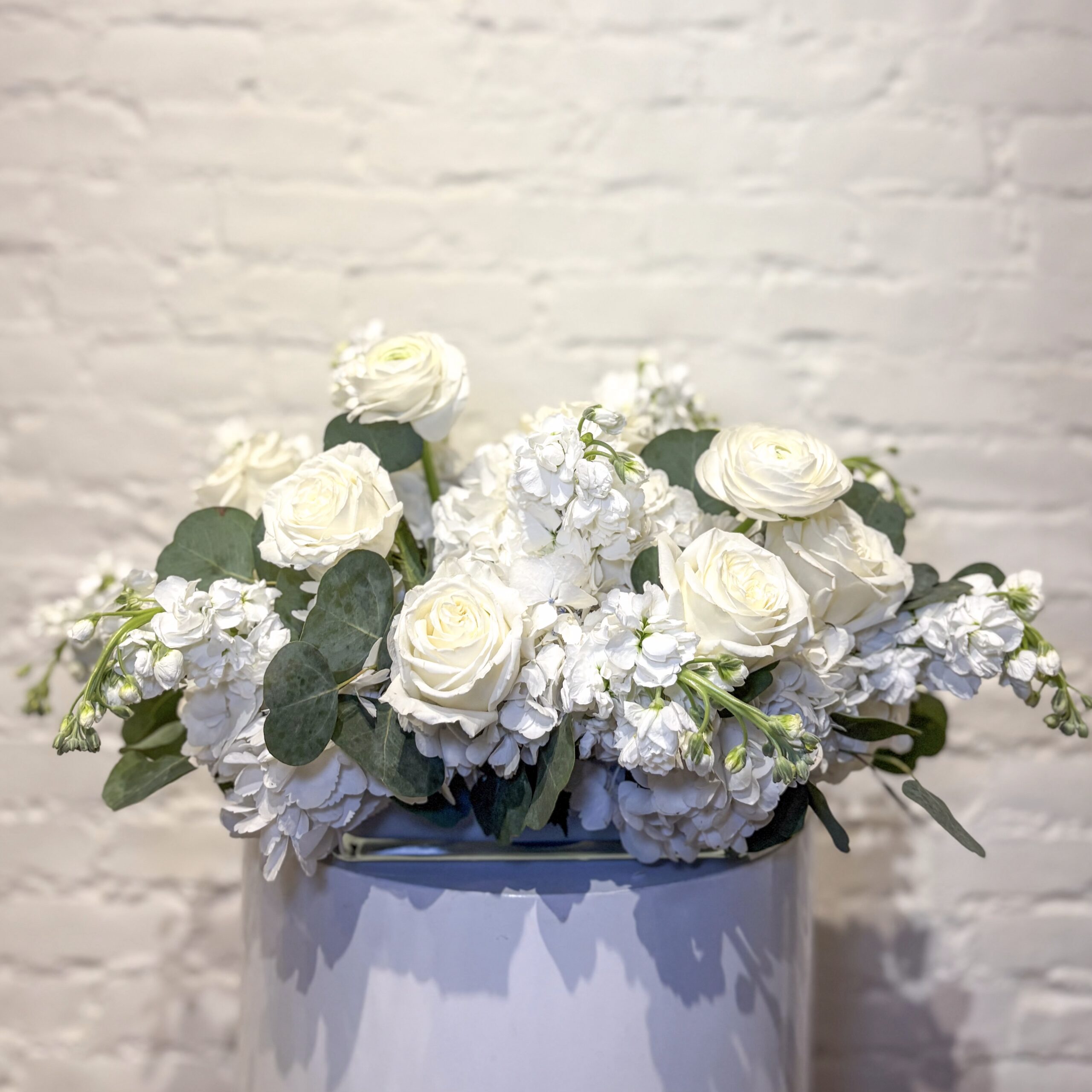 Elegant, soft, and effortlessly timeless, Lovely Whites is a beautifully curated everyday arrangement designed in serene shades of white and green. This lush design features fluffy white hydrangeas, classic white roses, delicate ranunculus, fragrant stock, and silver dollar. Thoughtfully arranged in a long rectangular container, it creates a full, garden-inspired look that’s both modern and romantic.
