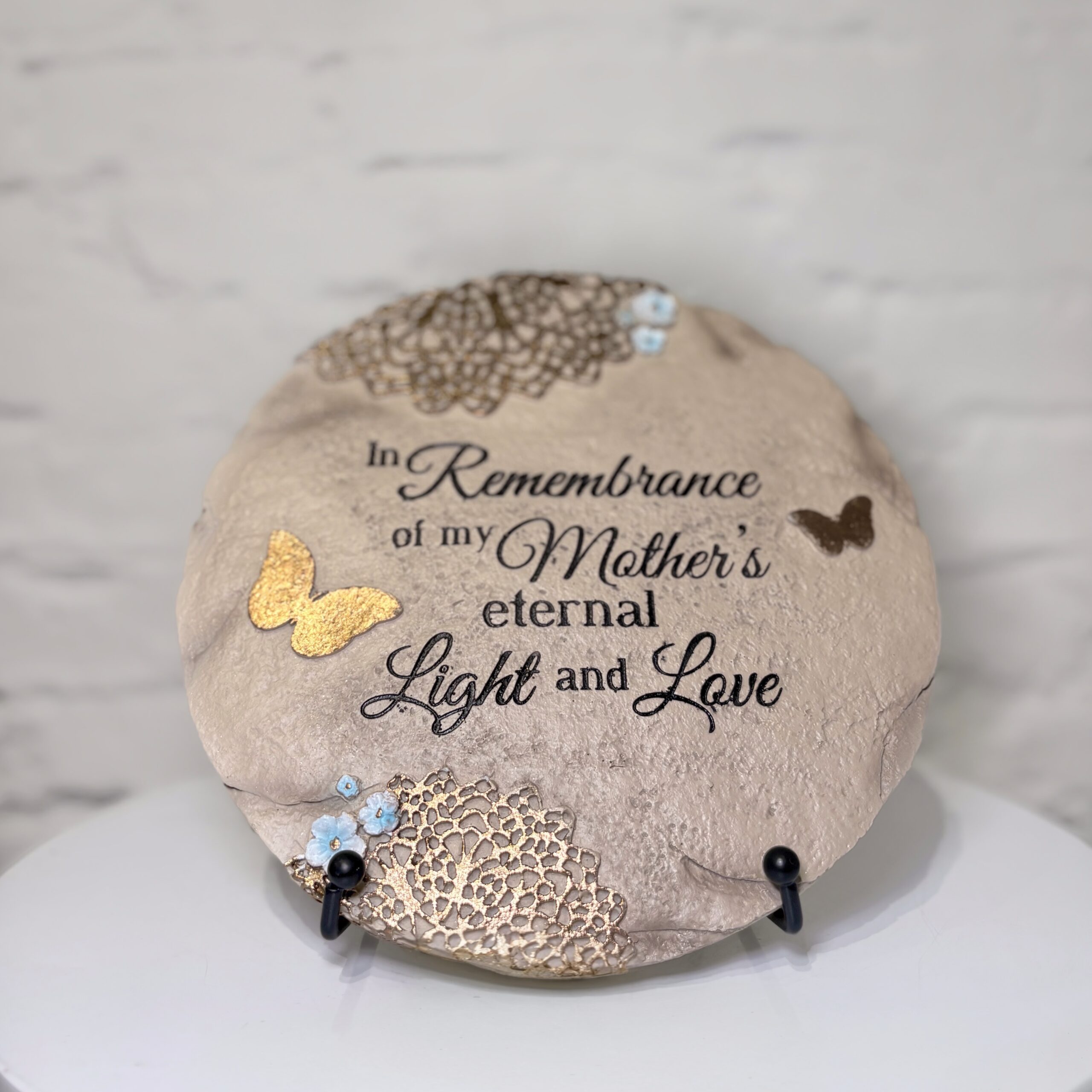 A beautiful keepsake created to honour and remember a beloved mother.This decorative sympathy plaque features the heartfelt message “In Remembrance of my Mother’s eternal Light and Love” accented with delicate butterfly and floral detailing in soft neutral tones. Designed to be displayed in the home, memorial space, or alongside sympathy flowers, it offers a lasting tribute filled with comfort and meaning.