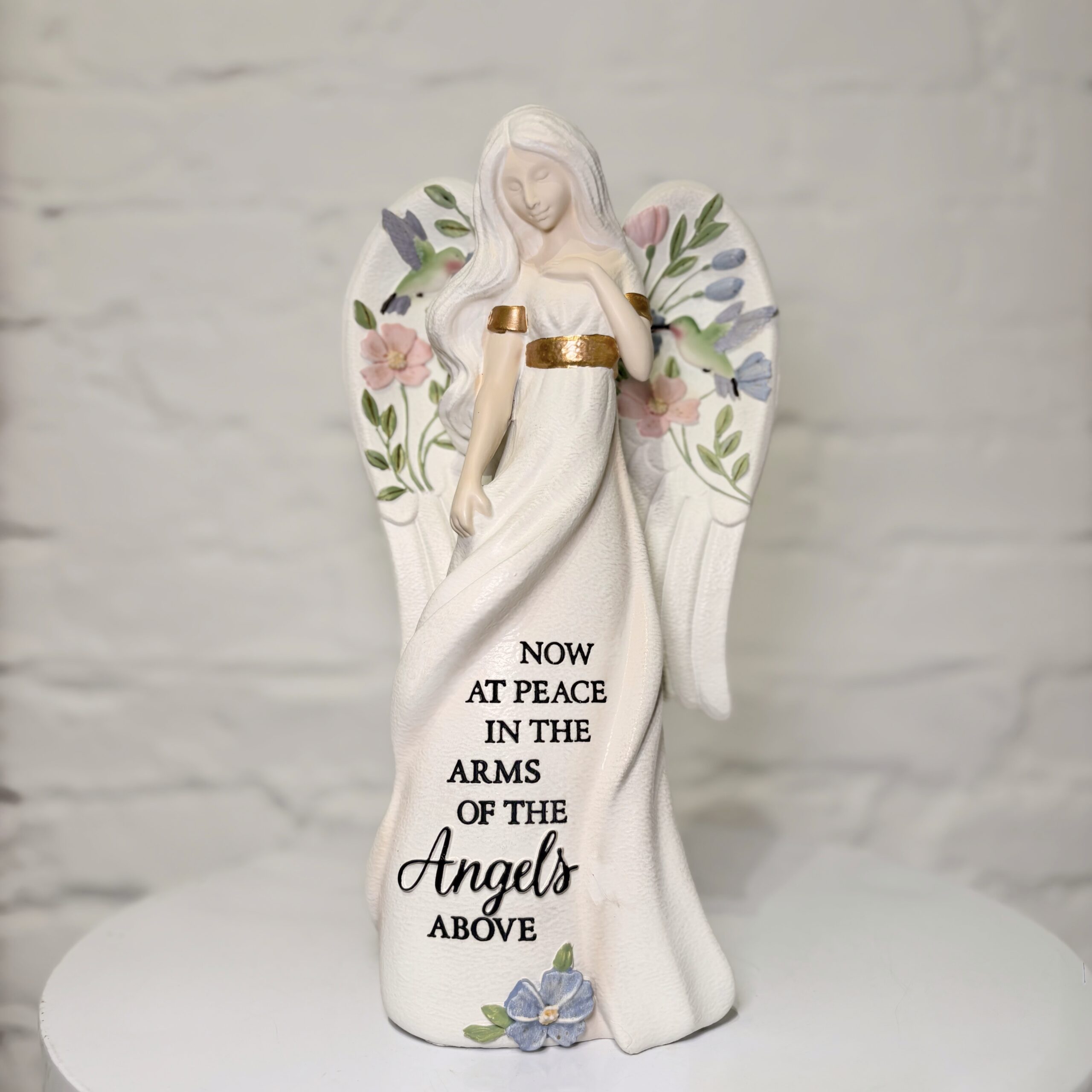 Graceful and serene, this angel figurine is a touching expression of comfort and peace. Featuring soft floral accents and delicate gold detailing, she stands as a symbol of calm, love, and remembrance. The message “Now at Peace in the Arms of the Angels Above” offers a heartfelt sentiment, making it a thoughtful gift during times of sympathy and reflection.
