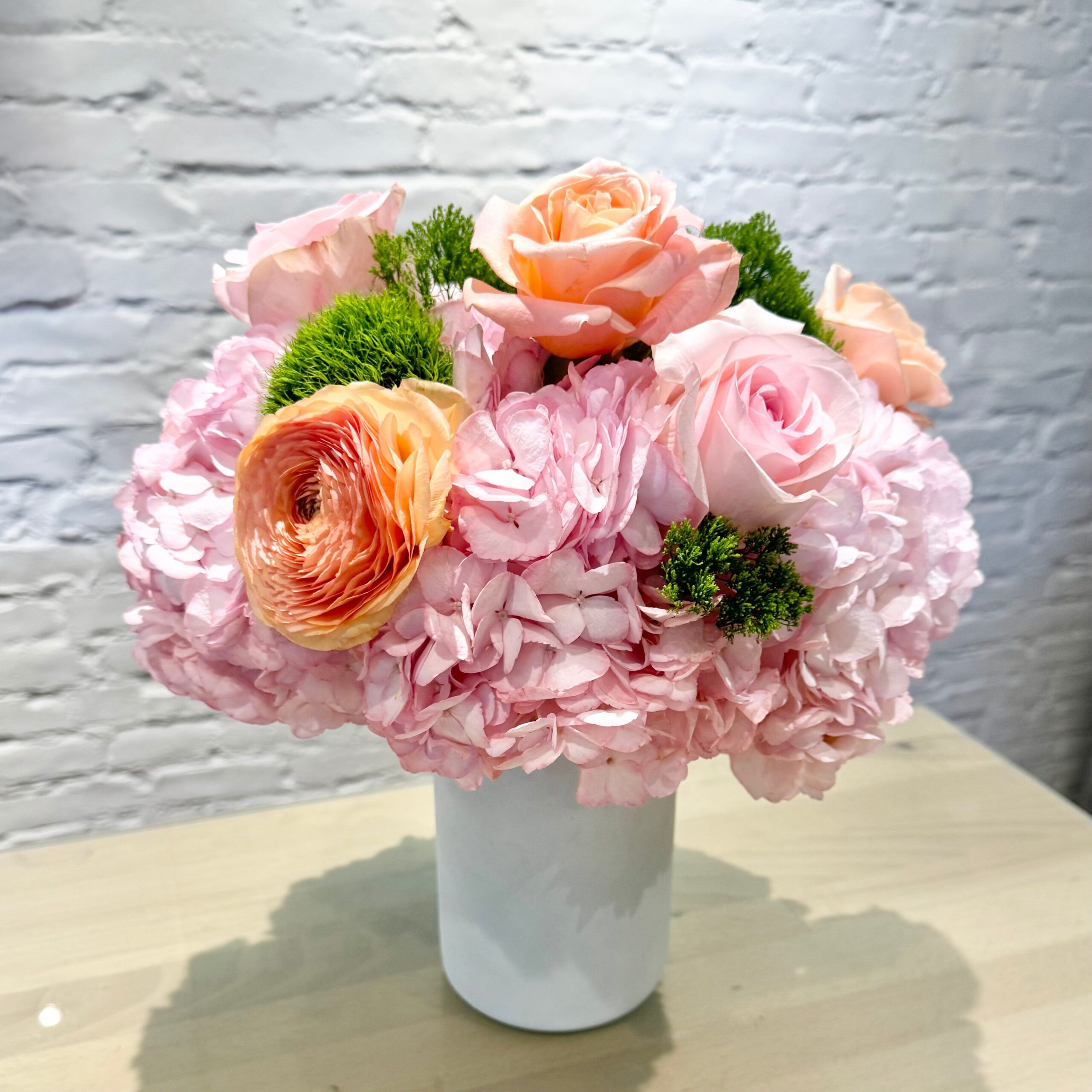 Peach ranunculus, pink roses and green dianthus nestled amongst fluffy pink hydrangeas in a tall white vase.
