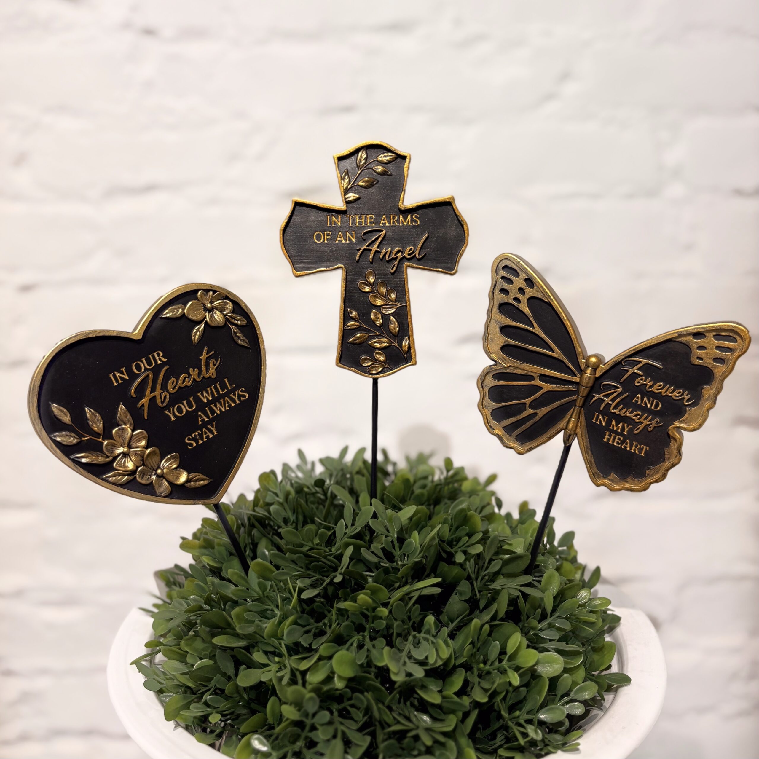 Add an extra meaningful touch to any sympathy floral arrangement with our Sentimental Sympathy Picks. These beautifully detailed keepsake accents are designed to offer a small message of comfort, remembrance, and love during difficult times. Choose your preferred style to be added into your sympathy flowers.