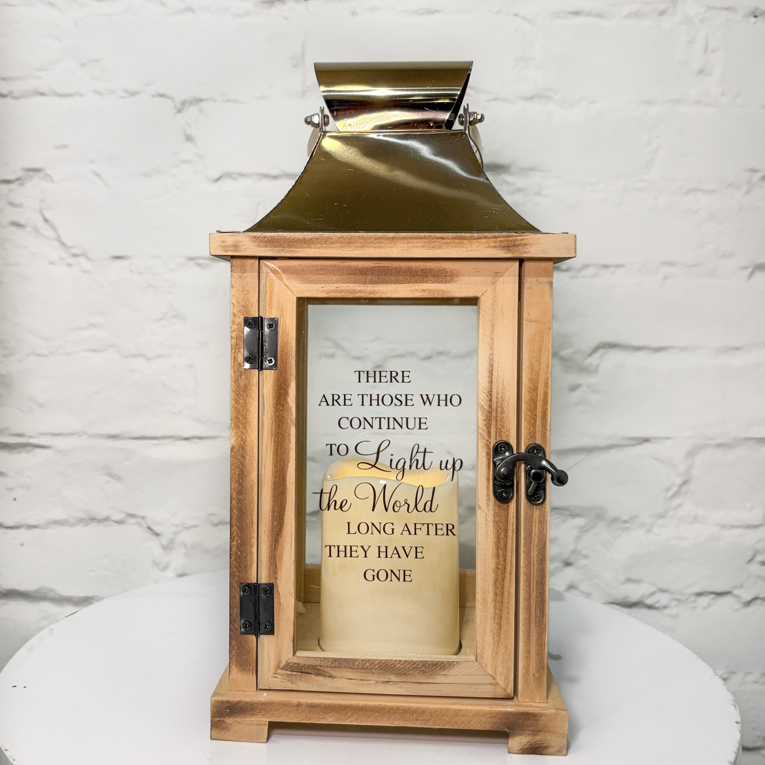 A beautiful wooden lantern with gold accents, available with 4 different quotes: